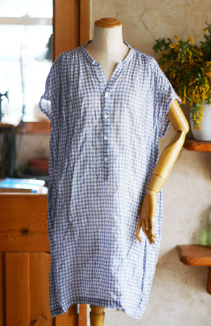 fa-403 nostalgic shirts O/P しなやかな゛柔らかいテンセル混の平織り生地を使用した、 シャツワンピース。 縦横等間隔にポリウレタン糸を織り込み、 クシュクシュとギャザーが入ったような 仕上がりになっています。 両脇にポケット付き。 自然で柔らかな質感が涼しげで印象的なワンピースです。 11.550yen 綿53/テンセル45/エステル1% 着丈95/肩幅66/身幅75cm