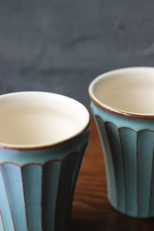 a-46 しのぎカップ トール // 松塚裕子 スマートなトールカップ。 コーヒーでも、ビールでも。 2.300yen (税別) サイズ: φ10×H8.5cm 素材:陶器